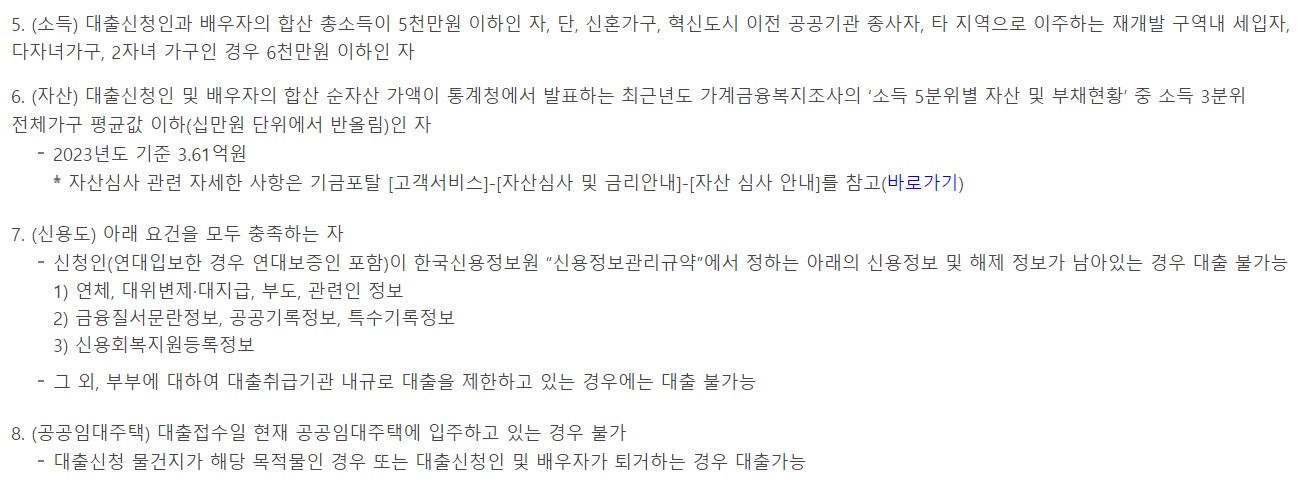 - 신혼가구나 혁신도시 이전 공공기관 종사자, 다자녀 등에 해당이 된다면 6천만 원 이하이면 됩니다.