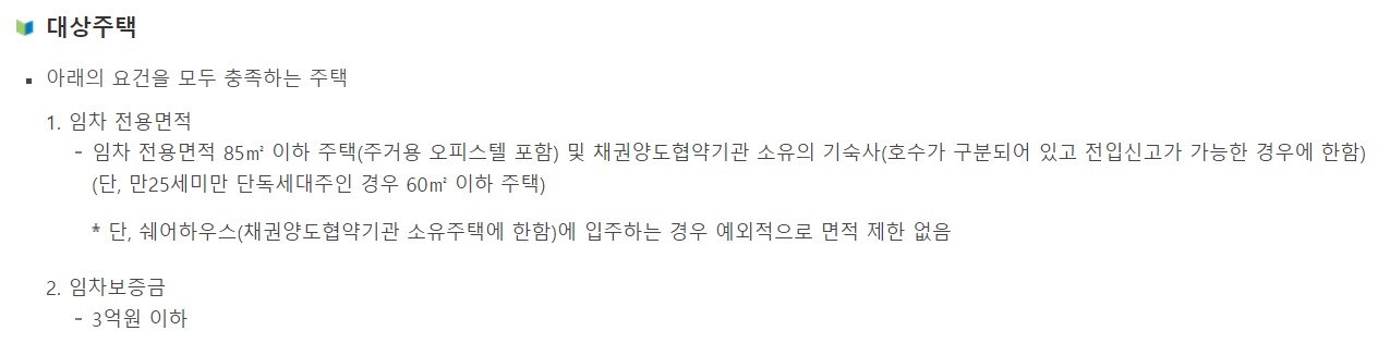 아래와 같이 임차 전용 85m² 이하 주택만 신청이 가능하며 주거용 오피스텔도 포함이 되고 채권양도 협약기관에 속한 기숙사 호수가 구분되고 전입신고가 가능한 곳은 신청이 가능합니다. 셰어하우스의 경우에는 면적 제한 없이 신청이 가능합니다.