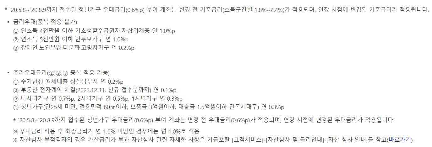 연소득 4천만 원 이하라면 1.0%, 5천만 원 이하에 한부모가구라면 1.0%, 장애인/노인부양/다문화/고령자가구는 0.2%가 우대가 되며, 추가우대금리는 주거안정 월세대출 성실납부자 0.2%, 부동산전자계약체결 0.1%, 다자녀가구 0.7%, 2자녀 가구 0.5%, 1자녀 가구 0.3%, 청년가구는 0.3%입니다.
