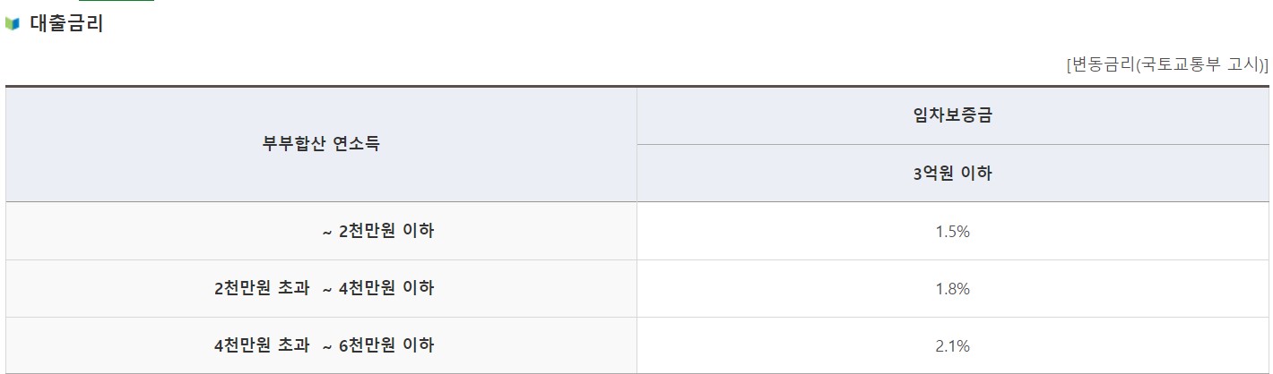 금리 : 대출금리는 연 1.5%~2.1%이며 부부합산 연소득은 기준에 따라 금리가 차등 적용됩니다.