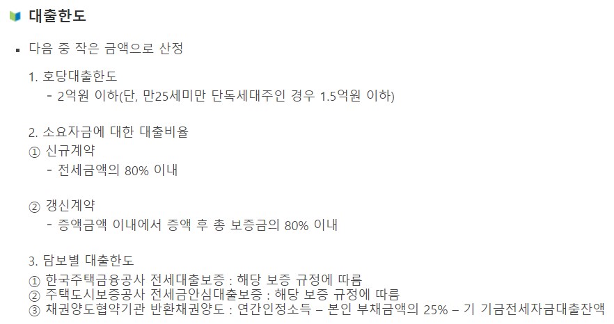 첫 번째는 호당대출한도입니다. 호당대출한도는 2억 원 이하이며, 만 25세 미만 단독세대주일 경우에는 1.5억 원 이하입니다. 두 번째는 소요자금에 대한 대출비율입니다. 만약, 신규계약이라면 전세금액의 80% 이내이고, 갱신계약이라면, 증액금액 이내에서 증액 후 총보증금의 80% 이내입니다.